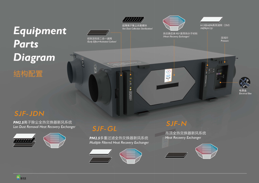 | SJF100JDN/SJF100GL/SJF100N | 220v | 266w/266w/260w | 1000m3/h | 170pa | 86%-91% | 36dB(A) | 1143 | 809 | 342 | 200 | 72KG |